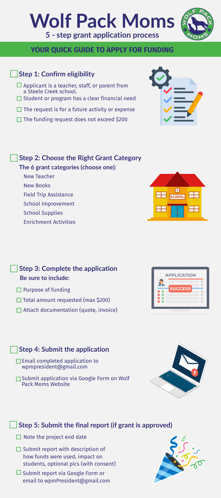 Challenge: Wolf Pack Moms provides small grants to support educational and extracurricular needs for students in the Steele Creek area. However, many applicants—teachers, staff, and families—struggled to understand the grant categories, eligibility requirements, and step-by-step process. This often resulted in incomplete or misaligned applications, creating delays and frustration for both applicants and the review team.